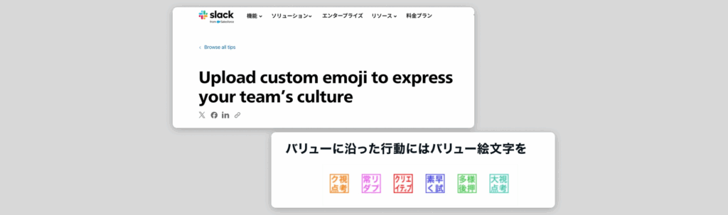 Slack公式HPにも「Upload custom emoji to express your team’s culture(チームの文化を表現するためにカスタム絵文字を登録しよう)」と書かれている/ note社では、企業のバリューを絵文字にしているそう