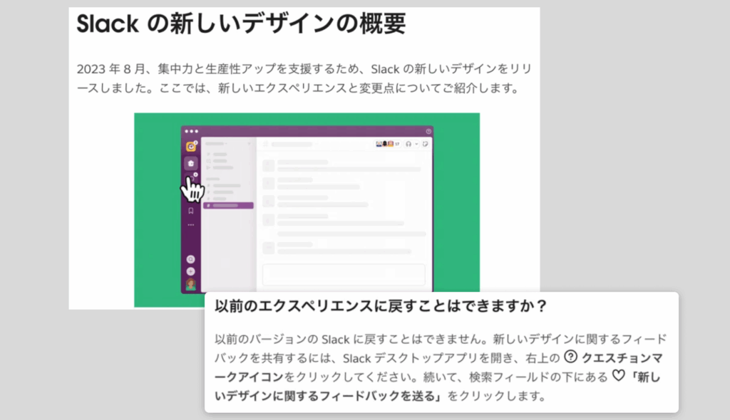 また、Slackは2023年8月に、集中力と生産性アップを支援するため、新しいデザインをリリースしました。新しいデザインについての質問やフィードバックをいつでも受け取れるような仕組みが用意されています。もしかしたら、あなたの小さな気づきがSlackチームに届いており、「Customer Love Sprints」での議題になっているかもしれません。